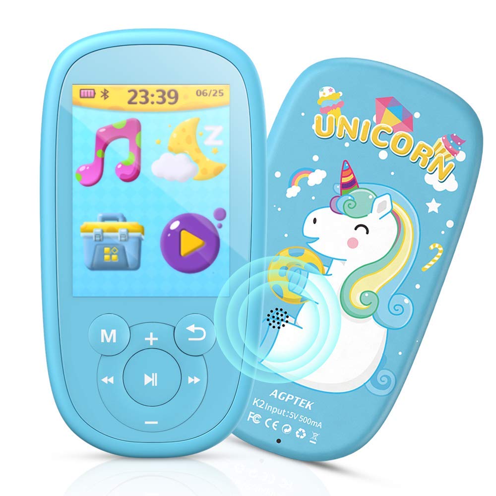 AGPTEK MP3 Enfant Bluetooth 8Go Licorne Design avec Haut-Parleur, Lecteur de Jeux Ecran 2.4’’ Ecouteur et Corde Inclus, Baladeur Musical Sport Radio FM Vidéo Enregistreur pour Cadeau de Fête-Bleu